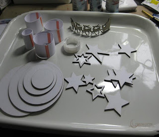 The circles in the pack seemed to me ripe for making into a Christmas tree. I wanted the whole project to be quirky and individual. Using card I made tubes to support the circles of laser cut board. Painted the board with Fresco chalk paint in Snowflake and followed with a coat of Metallic. Taking the Santas I coloured them with Copic markers and very carefully bent them into a semi circular shape, bending on the board and being careful not to break the joints between the sleigh and reindeer. I used Glue gel and built up the layers of circles with the card tubes between and added the Santas a layer at a time. Then came the pearls and the stars. Glitter into the glue gel is a little like snow and ice.